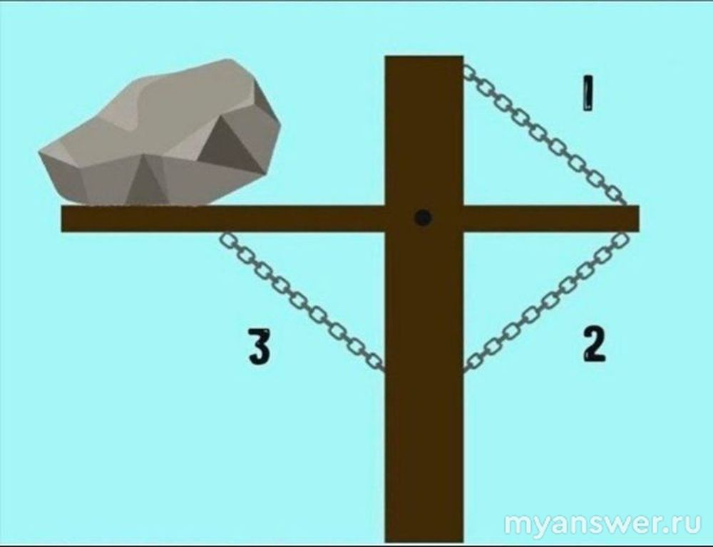 Все зависит оттого, как в середине двух конструкций закреплено и подвижна ли узенькая жердочка. Если неподвижна, то ни одна цепь не удерживает камень. А если она подвижна, то только цепь под номером 2 стоит в противовесе камню.