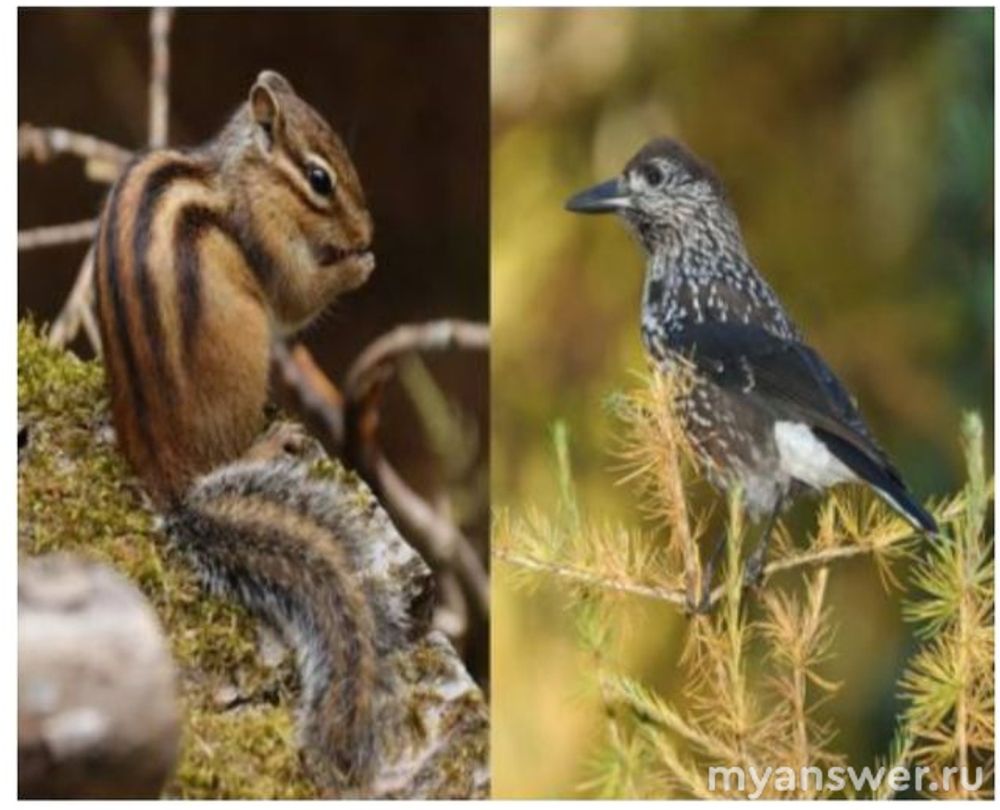 На фото у нас азиатский бурундук и кедровка. Я думаю, что вопрос несложный, и вы можете сразу выбрать из вариантов ответа подходящий. Но давайте всё же рассмотрим каждый.