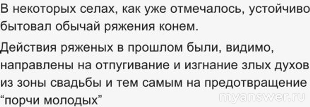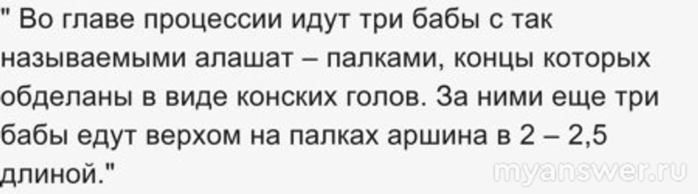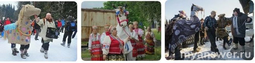 Здравствуйте. Конь играл важную роль в мордовской и удмуртской свадьбе, что позволяет предположить, что эта форма ряженья возникла под влиянием финно угров. На второй день свадьбы рано утром родственники жениха наряжаются милиционерами, врачами, цыганами и т. д. и с чучелом лошади идут в дом жениха. Ряженые пляшут, исполняя частушки эротического характера.