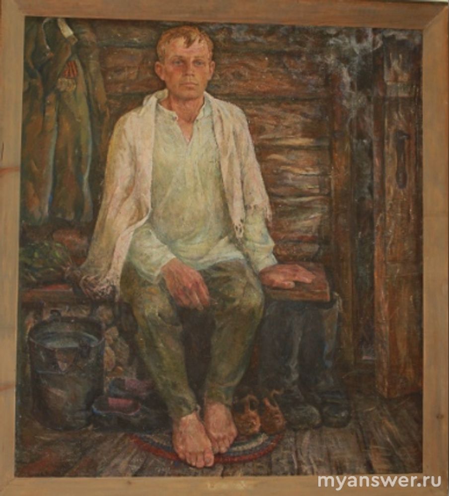 Вот как она выглядит, художник изобразил на ней своего отца, вернувшегося с войны, на самом деле отец не вернулся, он бежал из немецкого плена, в который попал под Сталинградом и был убит при попытке бегства, художник его совсем не помнил, но вот вернул его домой на своей картине, живого, с медалями на гимнастерке: