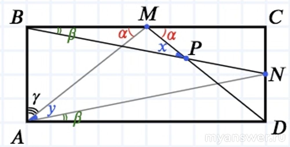 Точки М и N — соответственно середины сторон ВС и CD прямоугольника ABCD. Отрезки BN и DM пересекаются в точке Р. Докажите, что ∠MAN = ∠BPM.