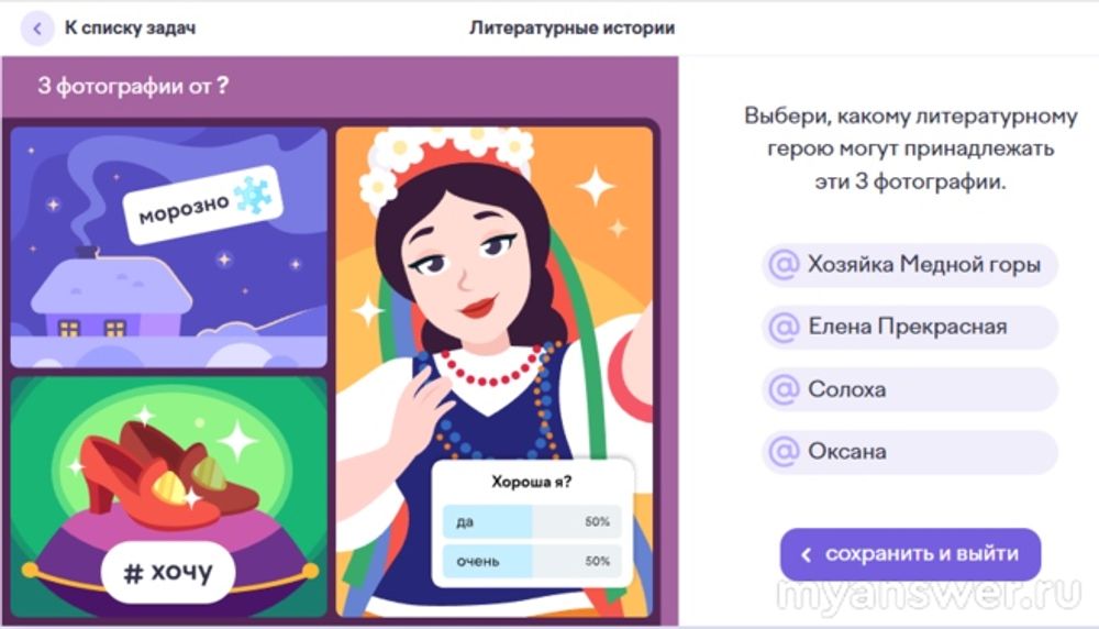 В данном вопросе из олимпиады "Культура вокруг нас", школьникам средних классов предлагают представить, что у литературных персонажей имеются социальные сети. Представлены две картинки, где они, якобы, разместили свои фотографии. По данным фотографиям ребятам нужно понять, о каком персонаже идет речь. На первой картинке красивая девушка делает селфи, дело зимой происходит, поскольку имеется фотография дома в снегу. Еще мы видим красивые туфельки с пряжками, черевички. Данные фото принадлежат гоголевской Оксане из произведения "Ночь перед Рождеством".