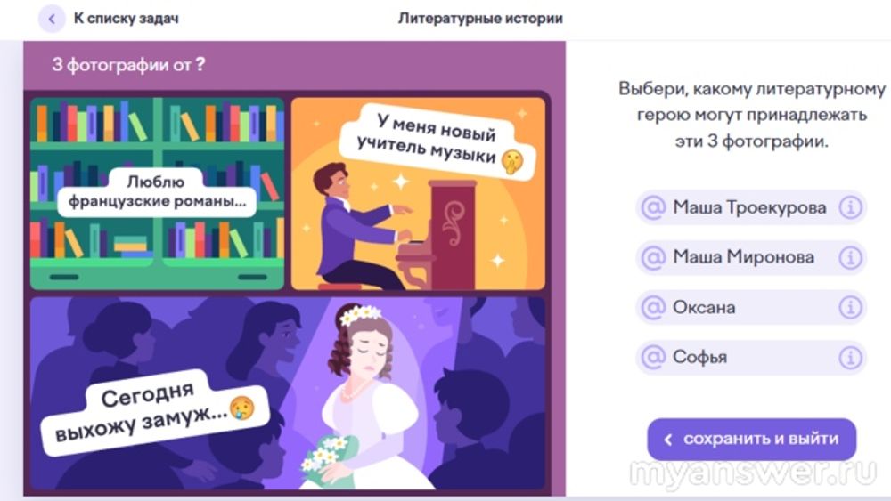 На второй картинке мы видим учителя музыки, полку с французскими романами и девушку в свадебном платье. Но она не очень-то рада замужеству. Это Маша Троекурова из произведения Пушкина "Дубровский".