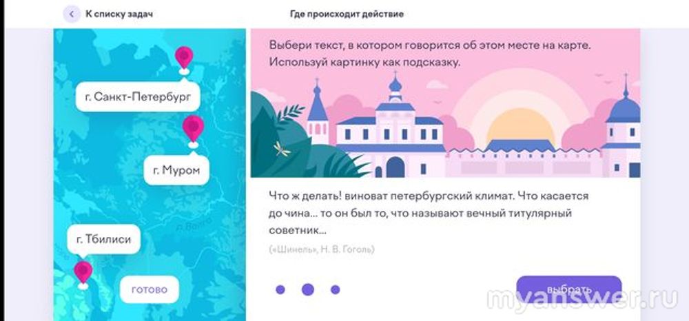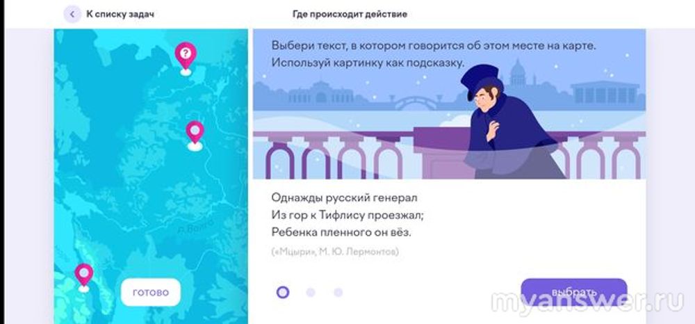 Задание "Где происходит действие" проверяет не столько знание классических литературных произведений, сколько навыки при обращении с географической картой. Небольшие затруднения может вызвать название Тифлис, куда подъезжал генерал. Так назывался в старину южный город Тбилиси. Получается, что на самом севере расположен Санкт-Петербург, на самом юге Тбилиси (Тифлис) и где-то посередине Муром.