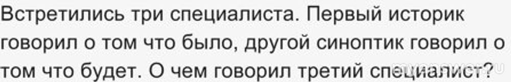 Интересный вопрос был задан на финале осенней серии игры "Что Где Когда" 3 октября надо было закончить фразу. Ответить кто такой этот третий. Историк говорил о том, что было, второй о том что будет, а третий говорит ....