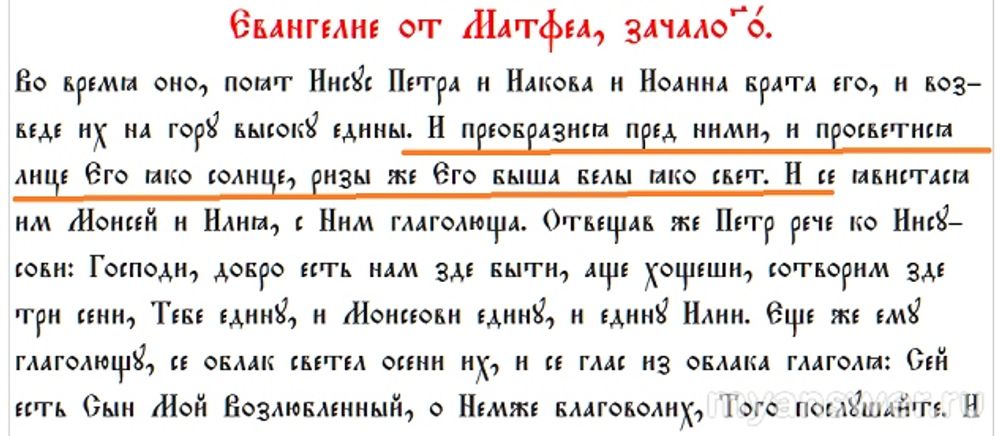 Вот, как выглядел эпизод с Преображением на церковно-славянском языке (Евангелие от Матфея)