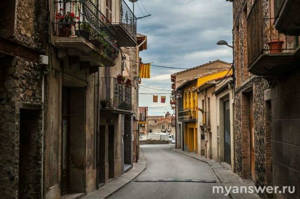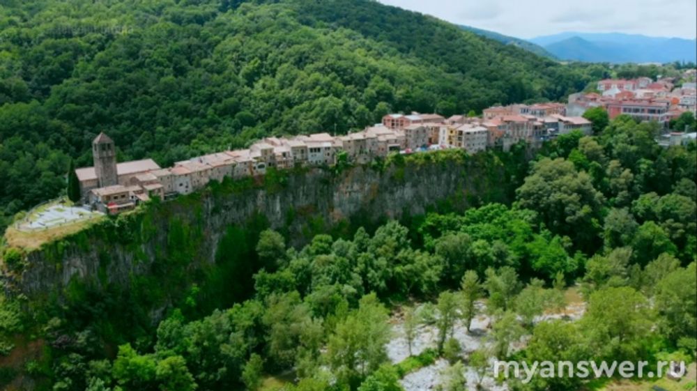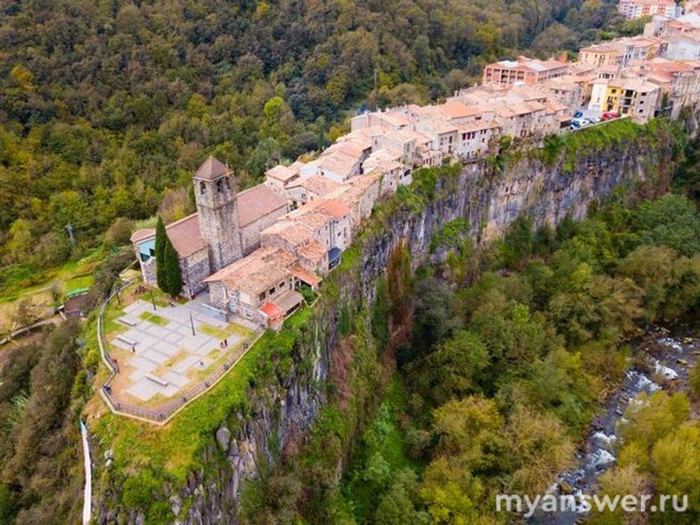 Город на скале Кастельфольит-де-ла-Рока, Испания. Средневековая деревня протяженность которой 1 км, а ширина — 50 метров. Это небольшой городок «висящий», на узком скальном плато над пропастью глубиной 50 м. Здесь всего одна улица и живут на ней около тысячи человек.
