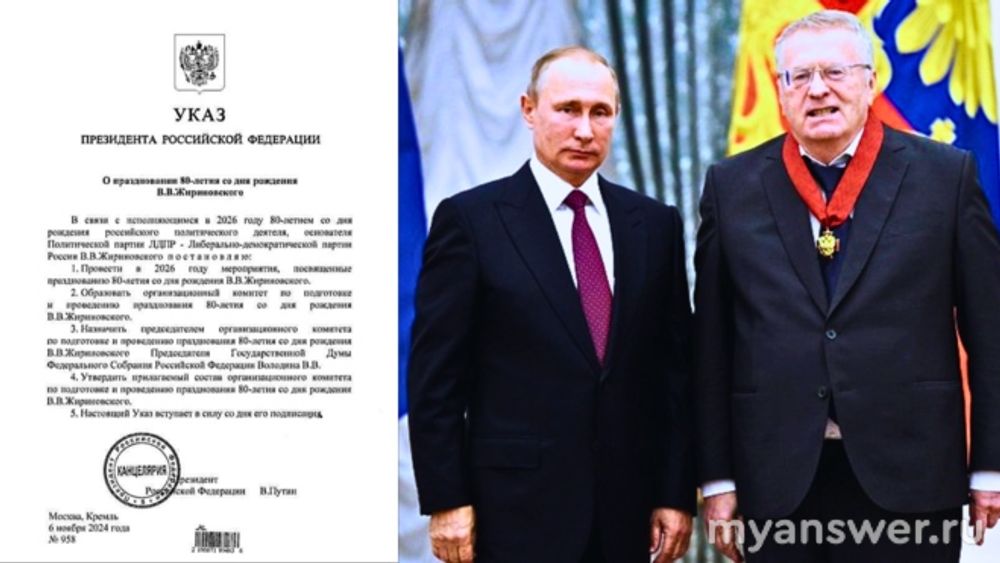 Президент Путин решил, что 80-летие Жириновского — это повод, который нельзя оставить без внимания, и подписал указ, что в 2026 году вся страна отметит эту дату. Указ подписан 6 ноября, и значит, к апрелю 2026 года надо будет всё подготовить: речи, памятные мероприятия, а может, и какой-нибудь памятник, от которого каждый прохожий будет получать заряд энергии и харизмы, как от самого Владимира Вольфовича.