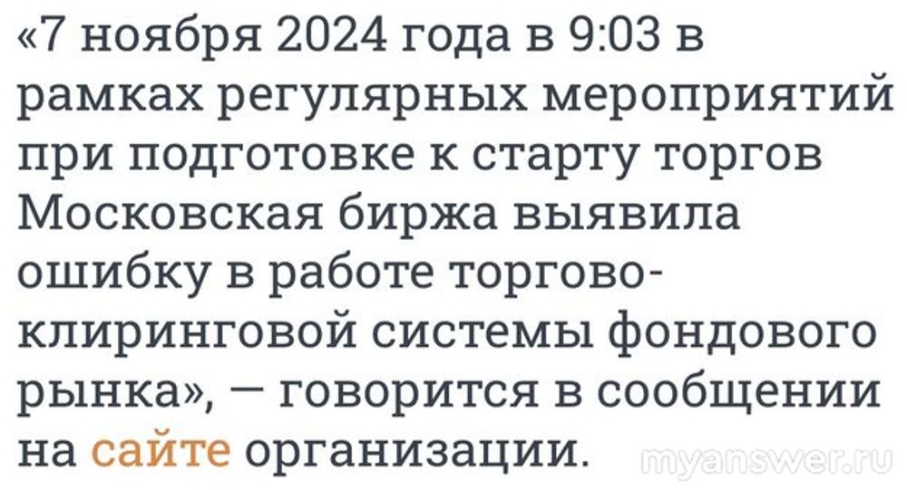 07.11.2024,в 10.00 по московскому времени на Московской бирже не было стандартного утреннего запуска торгов. Каких то разъяснений о причинах откладывания старта от Мосбиржи не было, в приложении появился пуш с краткой информацией: