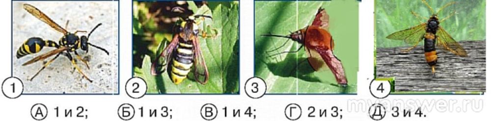 А вот на картинках 1 и 4 как раз перепончатокрылые насекомые - оса и рогохвост, их уж видно достаточно чётко, и сложно перепутать с другими насекомыми. Выбираем В.
