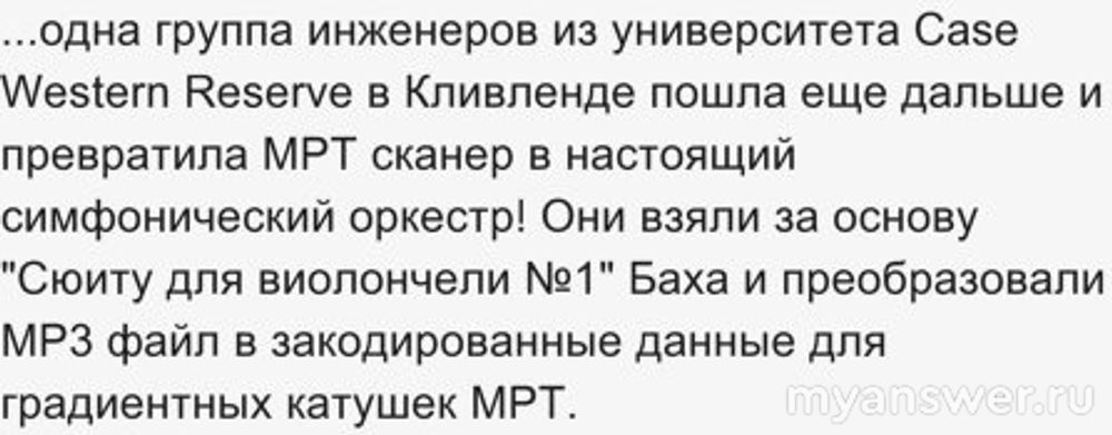 Ответ удивил, если не сказать поразил. Большей глупости я не встречал ранее. Группа инженеров в университете Кливленда преобразовала звуковой файл сюиты для виолончели в данные, которые мог прочитать медицинский сканер МРТ. Наверно меня никогда не перестанет мучить вопрос за чем? Кстати, игроки смогли правильно назвать ответ.