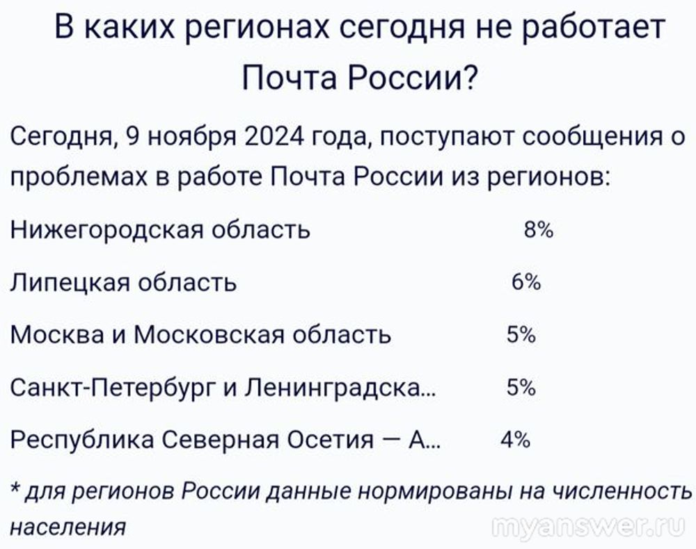 9 ноября 2024 года сервис "Почта России" испытывал явные проблемы в работе начиная с 9 утра по московскому времени.