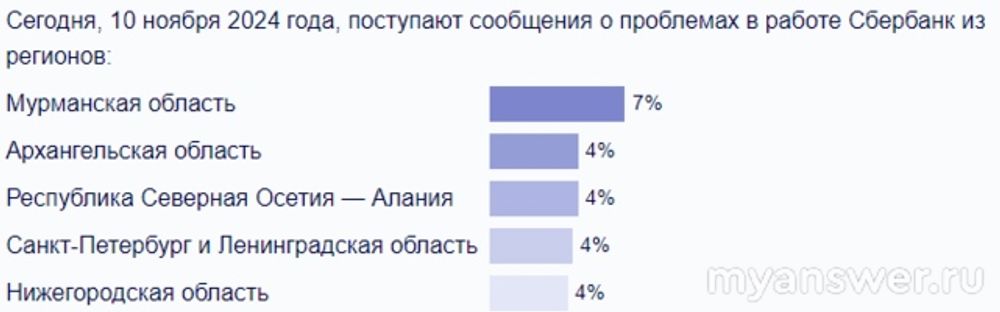 На 10 ноября 2024 года мое приложение от Сбербанка все также продолжает меня радовать своей безупречной работой, за что я им благодарен, но все же сбои в незначительной степени, но наблюдаются и это видно из представленного списка сбоев по регионам: