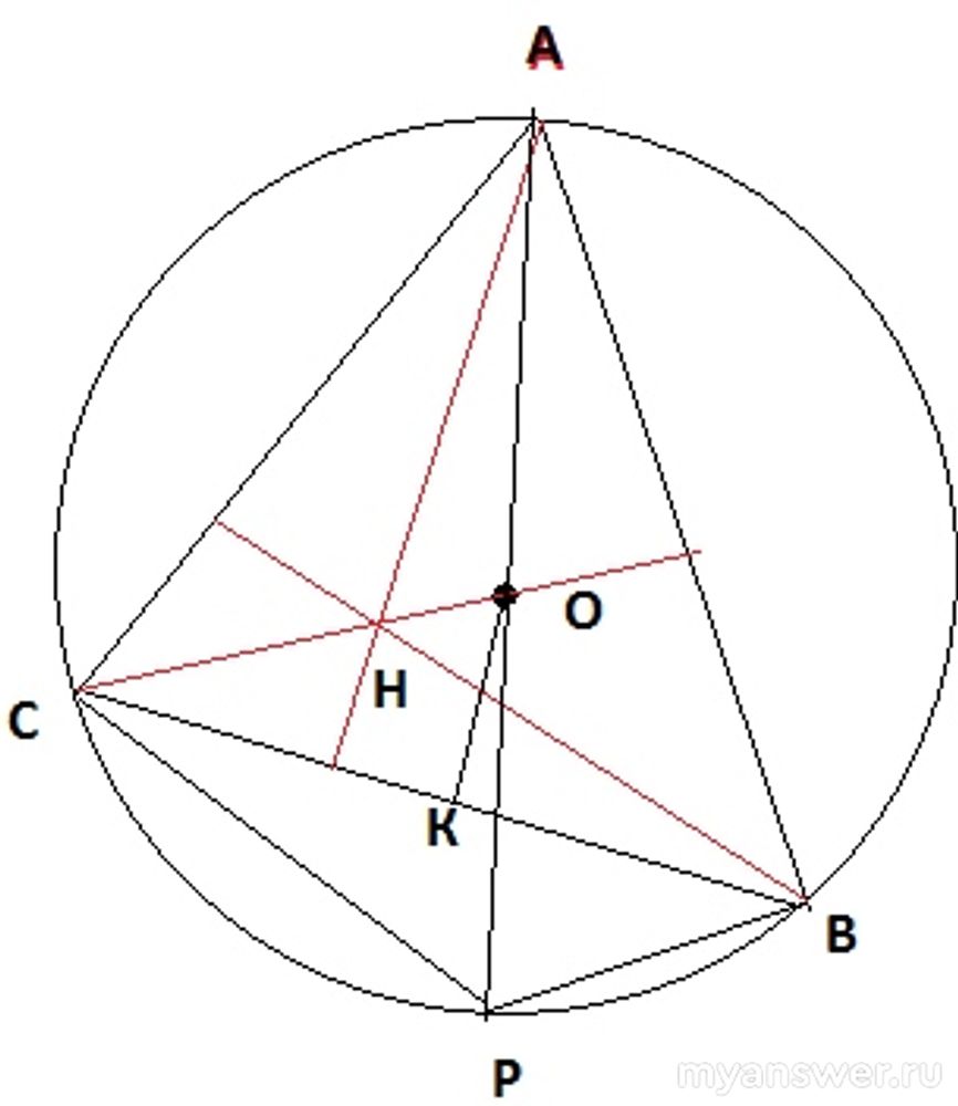 Остроугольный треугольник ABC, высоты которого пересекаются в точке H, вписан в окружность с центром O. Пусть P - точка на окружности, диаметрально противоположная точке A.
