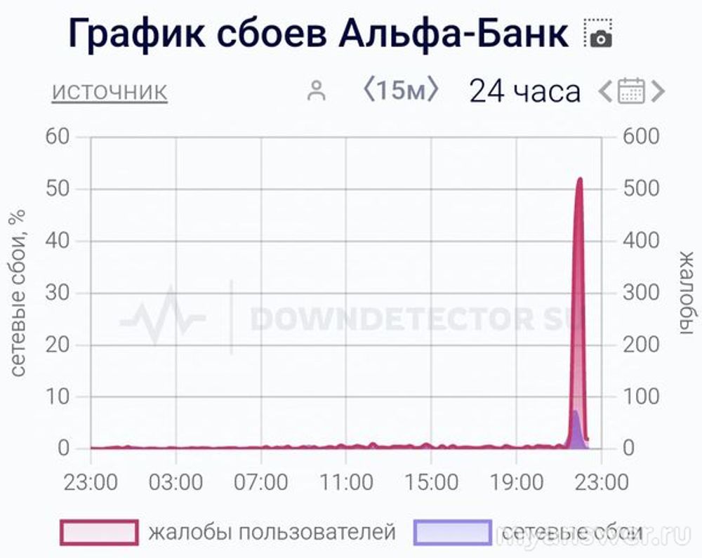 То что график мониторинга показывает - это небольшие временные сетевые сбои неизвестного происхождения, но не похожие на сетевую атаку на банк, скорее всего это что-то связано или с временной пониженной скоростью интернета в тех районах, или же проходят внутренние технические работы на портале, обновления. Что говорит о том, что вскоре всё заработает нормально онлайн в Альфе-Банке.