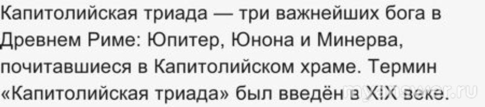 Мир богов рядом с миром людей. Римские боги и богини – это самая яркая страница в истории Древнего Рима. Ведь именно они определяли мировоззрение, традиции и культуру древних римлян, а также вдохновляли их на строительство храмов, создание произведений искусства, войны и завоевания. Капитолийская триада - это группа из трех божеств (Юпитер, Юнона и Минерва). Им поклонялись в древнеримской религии в храме на Римском Капитолийском холме. Капитолийская триада занимала самое главное место в общественной религии Рима. Юнона - богиня брака, семьи и материнства (женское здоровье и деторождение).