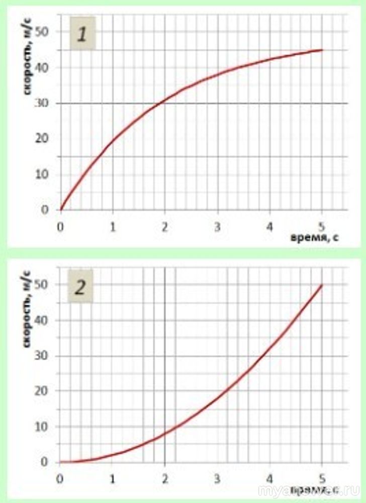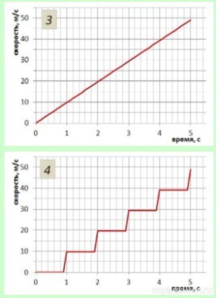 На графиках показана зависимость скорости движения камня от времени. Известно, что камень движется вертикально вниз, то есть свободно падает. Для свободного движения известно, что это равноускоренное движение, то есть скорость меняется равномерно. Зависимость скорости от времени выражается формулой: v=g*t, где g = 9,8 м/с2 постоянная величина. Значит график зависимости скорости движения камня от времени должна быть прямой линией. Из приведенных графиков только третий график является прямой линией. Ответ: 3.