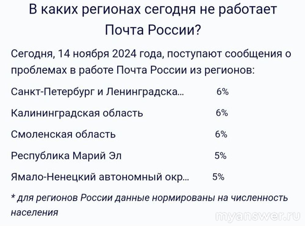 Сегодня 14 ноября Почта России испытывала трудности в работе в ряде регионов РФ. Больше всего жалоб поступало из Москвы(40%) и Санкт-Петербурга".