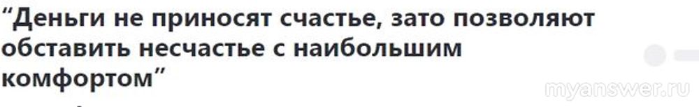 Сейчас в нашем обществе деньги, как ничто другое могут быть и носителями поддержки для счастья, то есть за деньги вы купите свободу, здоровье, жильё, комфорт и уют. Деньги избавят любого от множества проблем, и недооценивать их влияние, выдавливая из себя бессеребренника, глупо и неактуально. В какой-то мере это справедливо, но так не хочется всё измерять только деньгами.
