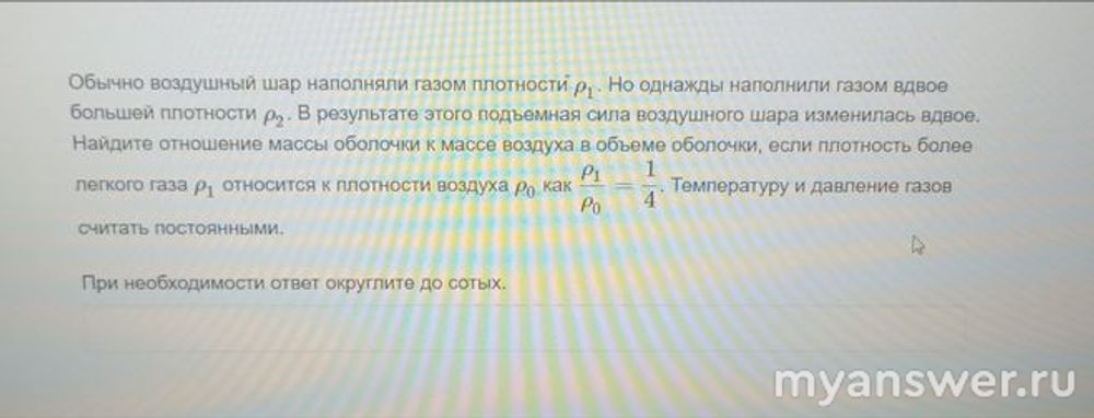 Для первого случая: Fn1=pgV-(mо+p1V)g, для второго случая: Fn2=pgV-(mо+p2V)g. По условию Fn1/Fn2=2, (pgV-(mо+p1V)g)/(pgV-(mо+p2V)g)=2 или (mв-mo-p1V)/(mв-mo-p2V)=2, где mв=pV - масса воздуха в объеме шара.