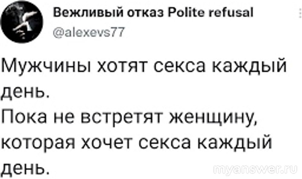 Ах да. Может быть, вы не хотите именно такой секс, который предлагает муж? Скорее всего, сценарий из классического порно. А может, найти в интернете ролик (трудно, да, таких почти нет), как мужчина лезет из кожи вон, чтоб удовлетворить партнершу? И показать мужу. Пусть-ка тоже поработает для вашего удовольствия, а не просто тупо потребляет.