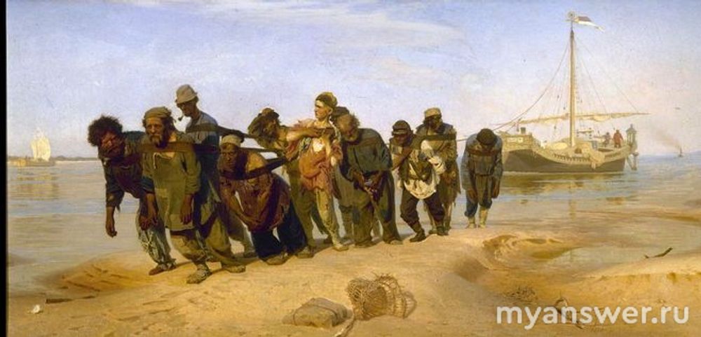 Даже не знаю, что сказать. Ветер дует одновременно условно влево и вправо. В левой части картины у дальнего берега парусник, парус и флаг на мачте, надут ветром вправо, а в правой части дым направлен ветром влево. Бурлаки: один трубку курит, один стоит, один повис, остальные не очень то и тянут. Парусник: на переднем плане, то ли нос, то ли корма, на дальнем плане чётко просматривается руль и человек держится за румпель. Может они его, наоборот, на мель садят, например для разгрузки? И ещё, находясь на воде, что нельзя робу постирать?