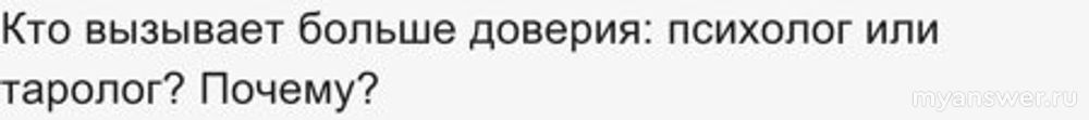 В области психологии, определённо, у меня больше доверия будет возникать к психологу. В области тарологии, соответственно, таролог. Совсем другое дело, если предполагаемое доверие совсем не связано с их профессиональным родом деятельности. Тогда, на первый план, при ответе на данный вопрос, выходят такие качества, как ум, мудрость, опыт, порядочность. Лично моё субъективное отношение к тарологам скептическое; не могу никак понять алгоритм получения достоверной информации от карт таро. В то же время, к врачам (в меньшей степени к психологам - не сталкивался ещё) доверия ещё меньше, чем к тарологам. Там вообще, у многих наших врачей ни то что алгоритма, знаний - на самом примитивном уровне. Я бы лучше спросил - Кто вызывает доверия меньше: психолог или таролог? Оба не вызывают ни доверия, ни чего-то ещё доброго. Один с лёгкость решает вопросы, другой с лёгкостью даёт ответы. Эта лёгкость и напрягает больше всего. С лёгкостью любой сможет.
