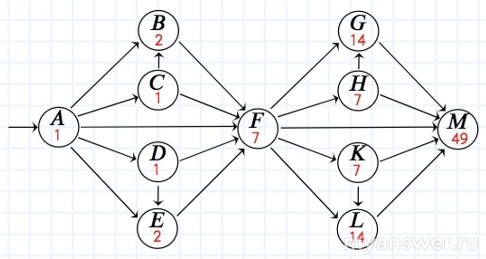 Теперь смотрим B (приходит 2 стрелки из А и С) B = A + C = 1 + 1 = 2