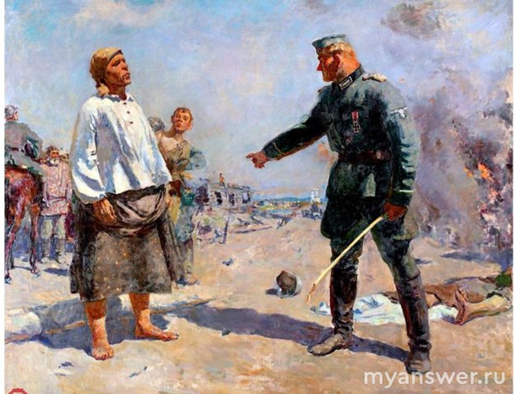 Картина потрясающая по энергетике, по исходящей от нее силе. Невозможно оторвать взгляд от лица матери – простой крестьянки, стоящей перед вооруженным, агрессивным врагом.