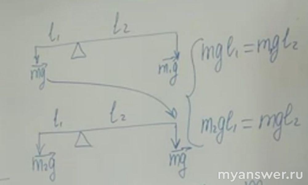 Принимаем реальную массу груза за m, по условию задачи m1=2 кг, m2=4,5 кг. Плечи рычага обозначим l1 и l2. Составим систему уравнений, где g - ускорение свободного падения: