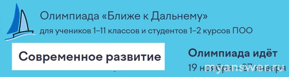 Олимпиада Ближе к Дальнему стартовала 19 ноября и будет идти до 27 января. В прохождении имеется 15 вопросов, и 4 темы Природа, география, культура , история и современное развитие. Каждая из тем информативна и интересна. Есть тенденция выбирать определенную тему и ее вопросы использовать для викторин или тем уроков. Здесь можно увидеть вопросы с ответами для темы "Современное развитие".