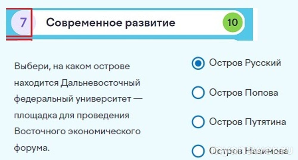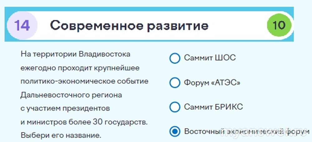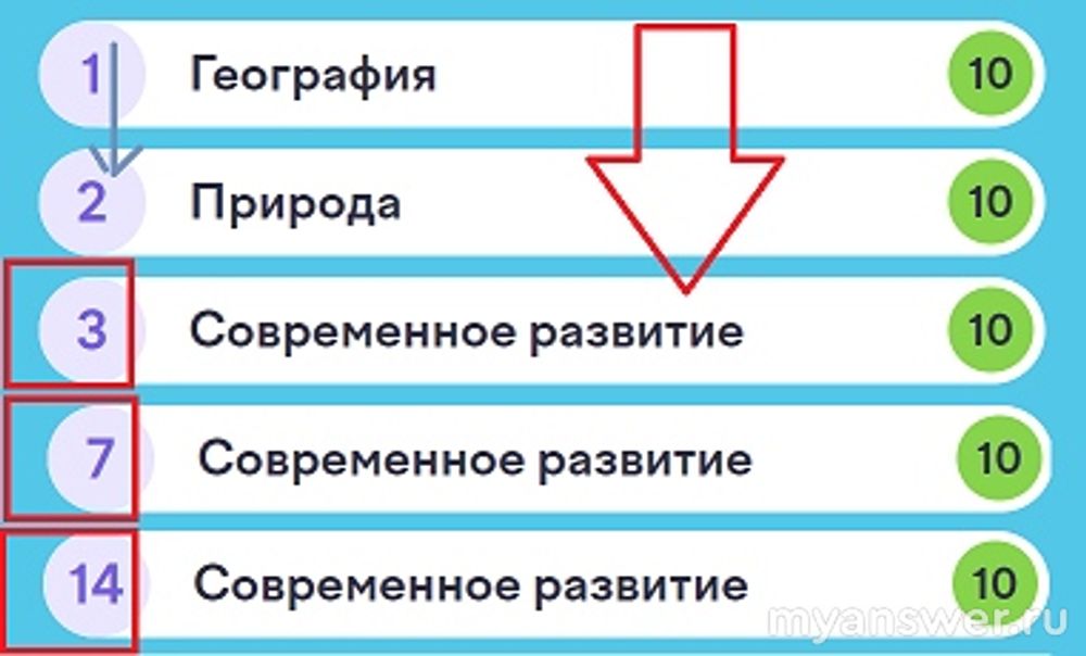 Смотрим как это выглядит. В данном прохождении 15 вопросов, на тему Современное развитие отводится три вопроса, обращаю внимние на номер вопроса, необязательно что они идут подряд.