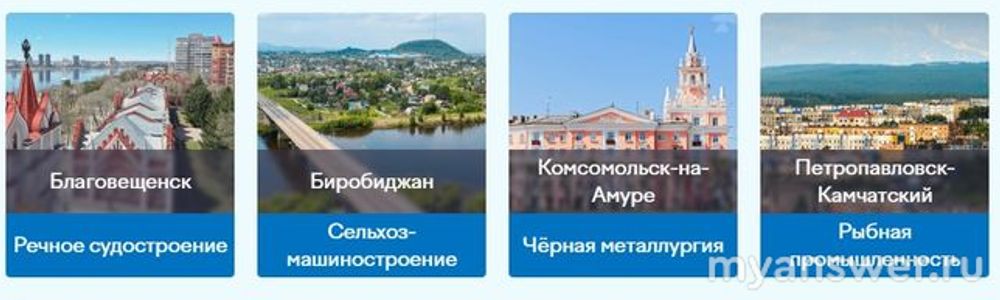 Первый вопрос про современное развитие региона представляет собой распределение промышленности по городам Биробиджан, Петропавловск-Камчатский, Комсомольск на Амуре. Где какая промышленность смотрим.