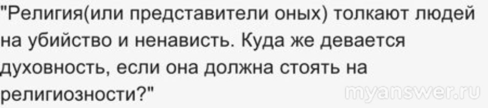 Если будем брать основной контингент любой религии мы увидим безнравственных, жестоких людей, что в прошлые века, так и нынче. Религия(или представители оных) толкают людей на убийство и ненависть. Куда же девается духовность, если она должна стоять на религиозности?