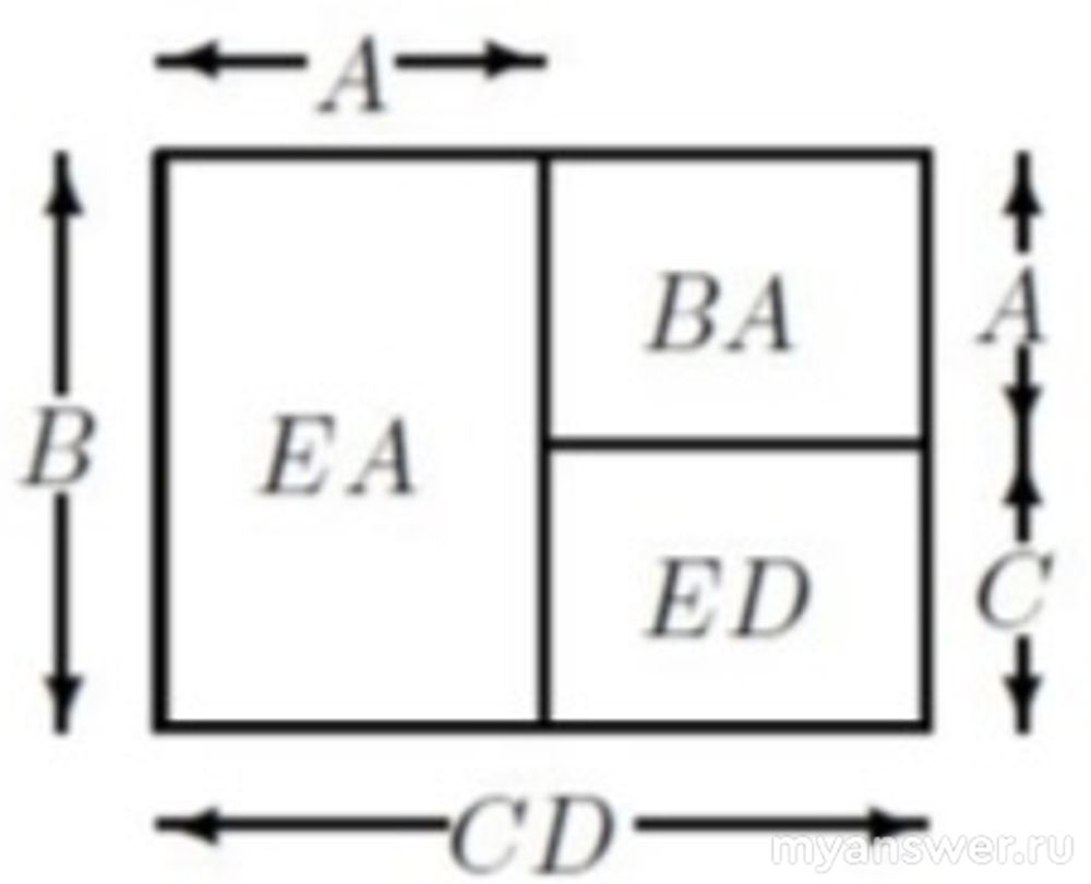 Числа на стрелках на рисунке означают длины отрезков, а числа внутри прямоугольников - площади этих прямоугольников. Каждая цифра заменена своей буквой от А до Е. Восстановите все цифры (ЕА, ВА и так далее - двузначные числа, а не результат умножения). Различные цифры заменены различными буквами, одинаковые цифры - одинаковыми. (Соотношения на картинке верны)