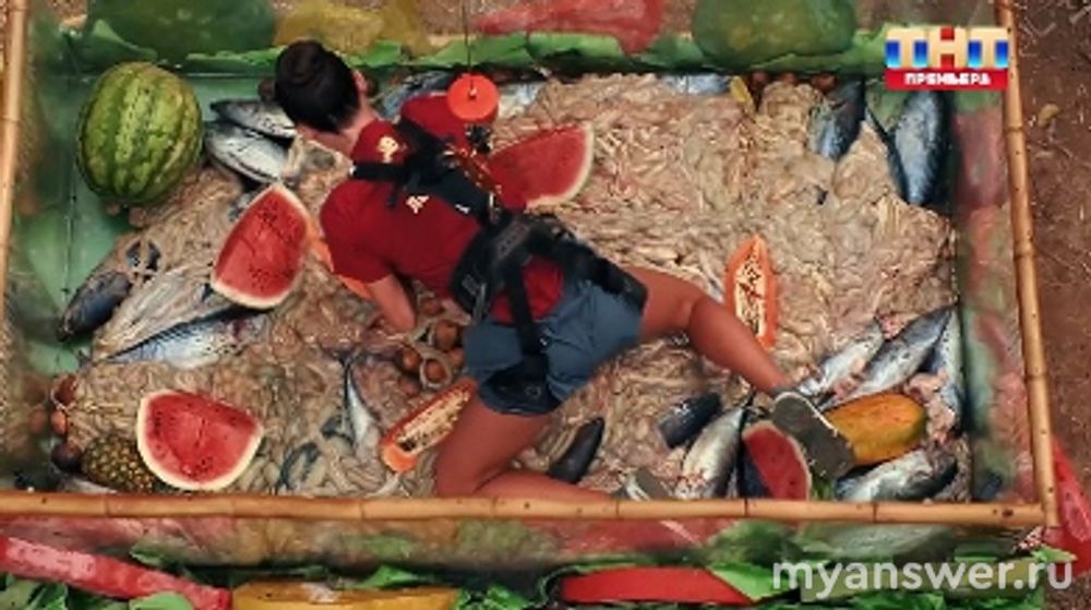 И на все это отведено 15 минут. Лерчек проходила испытание самоотверженно. Захватывала как можно больше улова. Доносила его до нужной емкости. Это было просто омерзительное испытание. Понимая, что монет нет, Лерчек начала обматываться кишками.