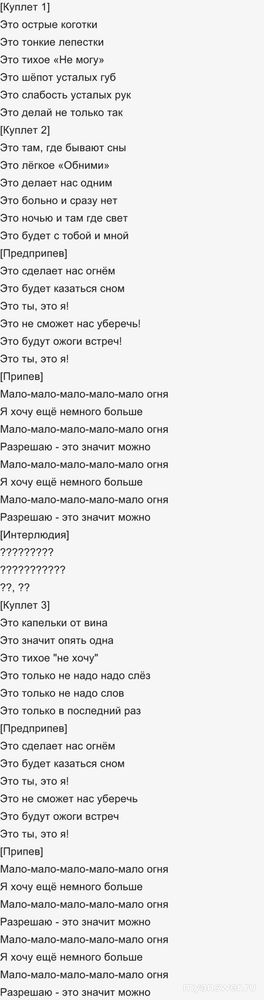 Ниже в ответе представлен текст песни "Мало огня":