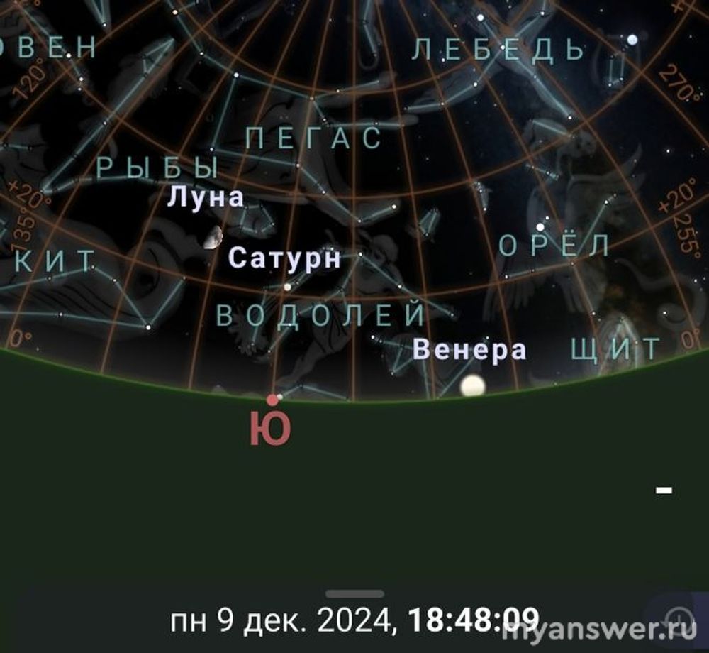 Венера и Сатурн могут быть видны на юге после захода солнца. Сатурн чуть ниже и правей Луны. Венера очень низко.