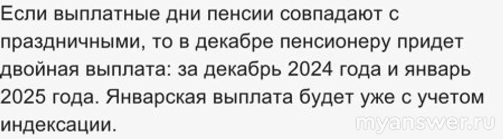 А вот если по графику дата выплаты пенсии за январь 2025 приходится на один из дней в период с 2 по 8 января 2024 включительно, то пенсионеры получат пенсию за январь еще в декабре 2024 года.