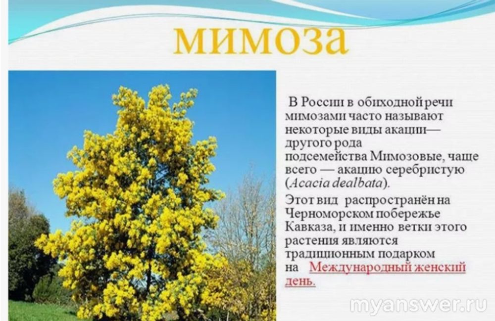На следующей паре слайдов введи описание кустарников, например, мимозы и глицинии.