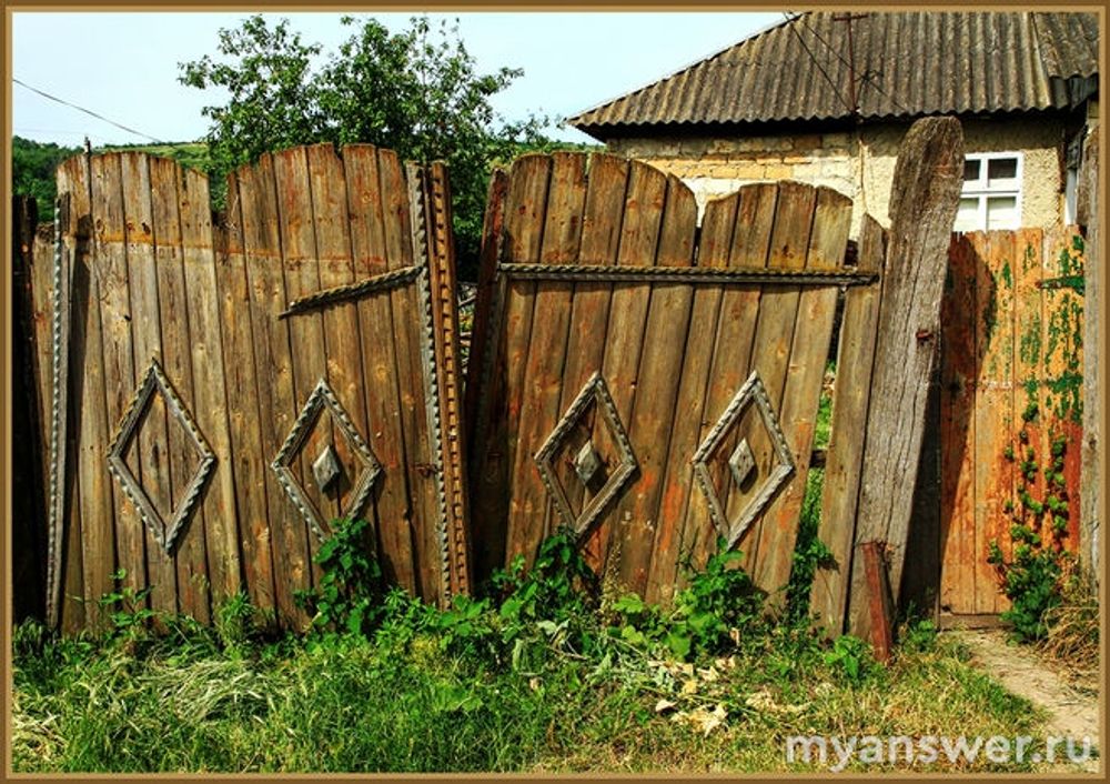 Образ старения на фотографии создается покосившимися воротами и заросшей калиткой, то есть некоторой частью некогда с выдумкой и старанием (о чём свидетельствуют украшения на воротах) возведенного забора.