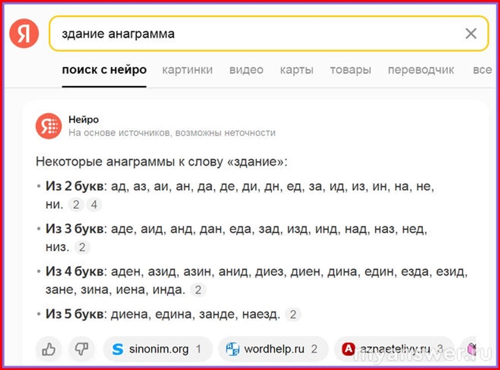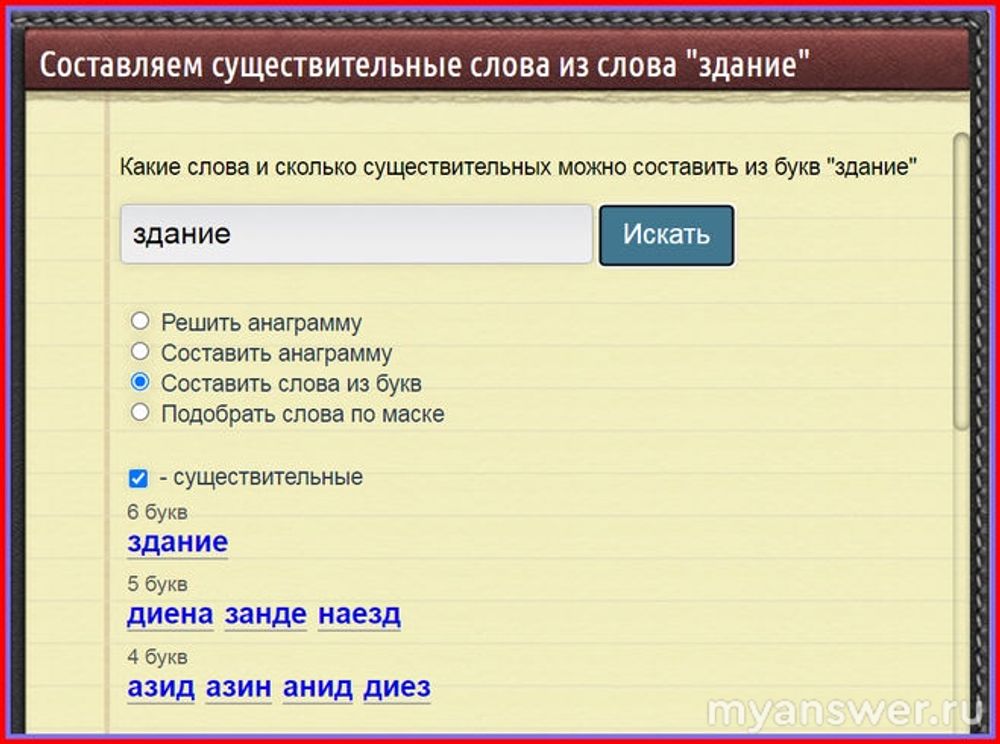 В наше время своим собственным умом искать анаграммы к словам - дело явно не благодарное. В Интернете просто огромное количество сайтов, которые с лёгкостью сделают это за вас, предложив множество возможных вариантов. Например, на картинке мы видим какое-то здание. Если «зарядить» это слово «здание» в окно сервиса, в ответ можно получить сразу три - «диена», «зинде» и «наезд». Только это не анаграммы, а всего лишь слова, составленные из некоторых букв слова «здание». Ведь в них по пять букв, а в исходном шесть: