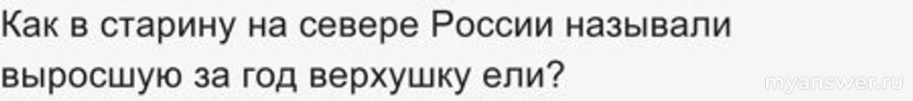 Вот и вчера в пятницу двадцать девятого декабря был задан вопрос, как раз в предверии Нового Года. "Как в старину раньше где - то на севере нашей необъятной родины выросшую за один год верхушку ели как называли?".