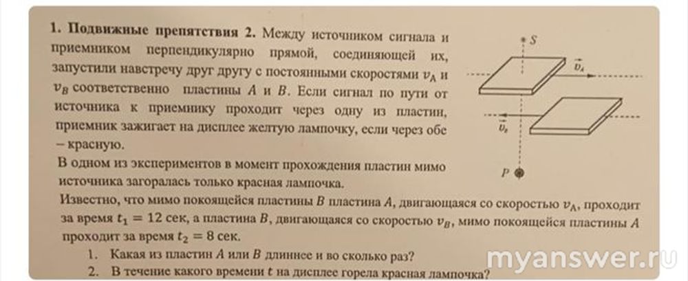 Между источником сигнала и приемником перпендикулярно прямой, соединяющей их, запустили навстречу друг другу с постоянными скоростями Va и Vb соответственно пластины A и B. Если сигнал по пути от источника к приемнику проходит через одну из пластин, приемник зажигает на дисплее желтую лампочку, если через обе – красную. В одном из экспериментов в момент прохождения пластин мимо источника загоралась только красная лампочка. Известно, что мимо покоящейся пластины B пластина A, двигающаяся со скоростью Va, проходит за время t1 = 12 сек, а пластина B, двигающаяся со скоростью Vb, мимо покоящейся пластины проходит за время t2 = 8 сек.