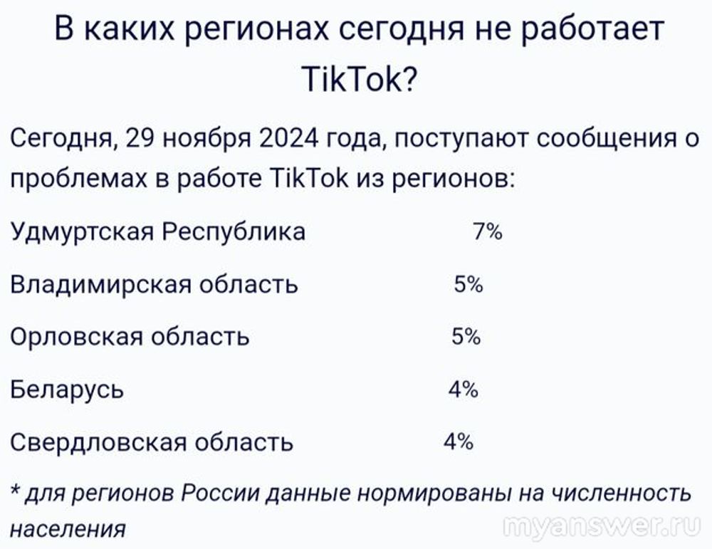 В основном недовольства работой "TikTok" выражали жители Удмуртской республики, Владимирской области, Орловской области.