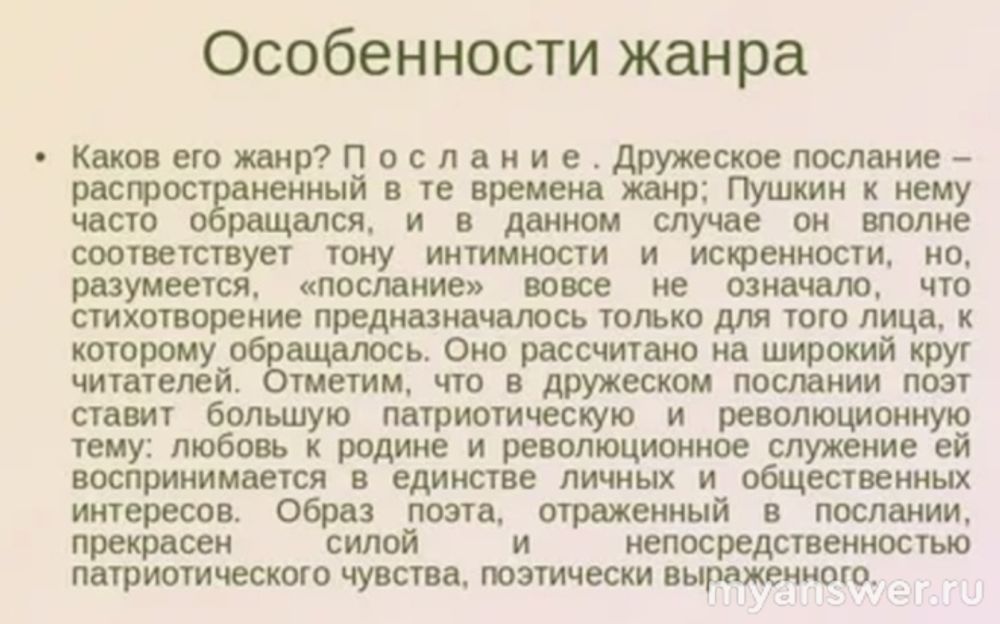 В стихотворении Пушкин обращается к своему давнему, горячо любимому другу, но делает это публично (в те времена такое обращение было вполне обыденным и распространенным). Поэтому жанр стихотворения я бы определила как послание.