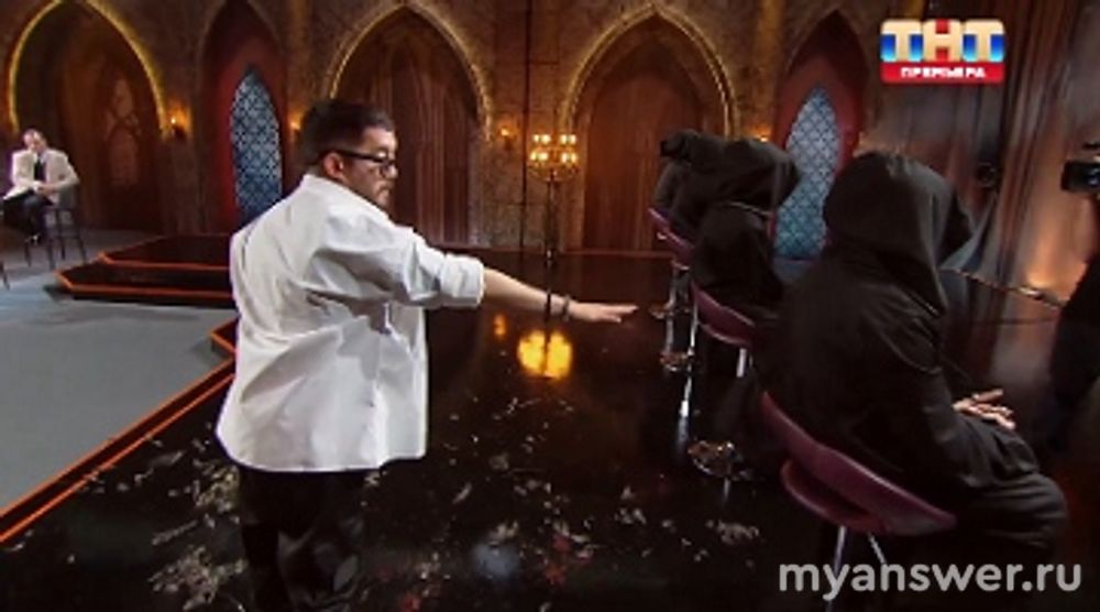 В первом испытании нужно было найти экстрасенса среди шести человек, сидевших спиной к участникам и полностью спрятанных под черной мантией.