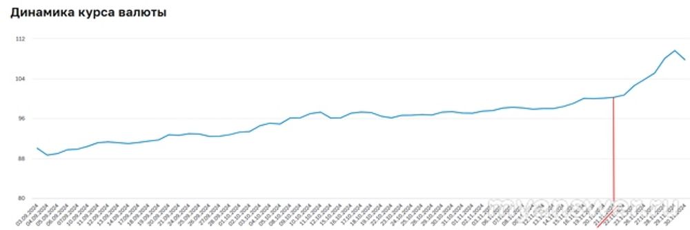 Главная причина - рост рисков ядерной войны после боевого применения "Орешника", ракеты, которая может нести на себе ядерные заряды. Это даже на графике курса хорошо видно - резкий рост начался буквально через день после этого события (не на следующий - потому что у нас курс валюты не рыночный, потому что биржи под санкциями и торговать на них валютой нельзя, а устанавливается Центробанком вручную по результатам внебиржевых торгов, то есть, имеется небольшая задержка по времени).