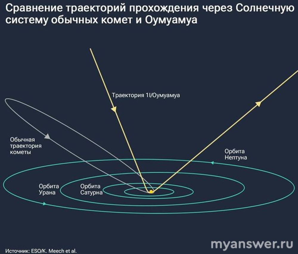 Траектория полета Оумуамуа (схема сравнения траекторий полёта обычных комет и Оумуамуа через солнечную систему)