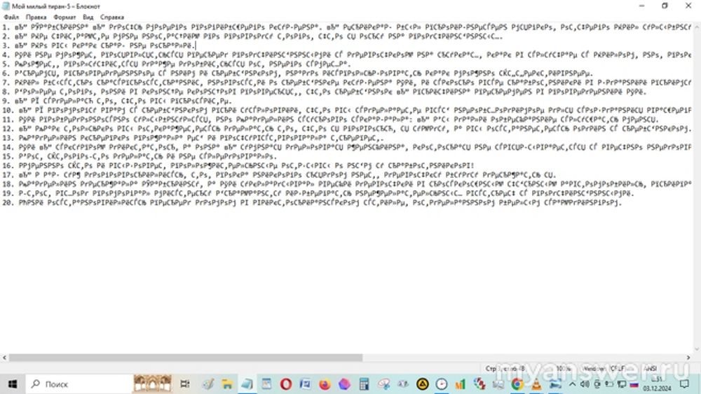 Текст я не печатал вручную, а скопировал и вставил из своего аккаунта в Непубликуемом личном дневнике. Когда я вставлял текст, а потом сохранял файл "как" и потом закрывал "Блокнот", он отображался нормально, обычными буквами. А когда открыл файл всего несколько часов спустя, то увидел вот это (скриншот). Удивление было таким сильным, что я минуту сидел, разинув рот (в буквальном смысле выражения). Причём сегодня такие "сюрпризы" я обнаружил сразу в трёх текстах, созданных вчера таким же образом. Раньше "Блокнот" никогда так себя не вёл, текст из этого же самого источника я копирую и вставляю далеко не впервые, таких сюрпризов не было. "Блокнот" всегда был самой надёжной на компьютере программой, а теперь я не знаю, чего от него ждать в следующий раз. Кстати, не связано ли это как-то с тем, что я поставил Wise Care? После её установки я заметил, что некоторые сайты, которые до этого так себя не вели, стали отображаться чёрт знает как. Три года назад с сайтами была такая же проблема, и появилась она тоже после установки Wise Care, так что вряд ли это совпадение. Не могла ли эта программа повлиять подобным образом и на Блокнот? И как вернуть тексту его первоначальное отображение (буквами)?